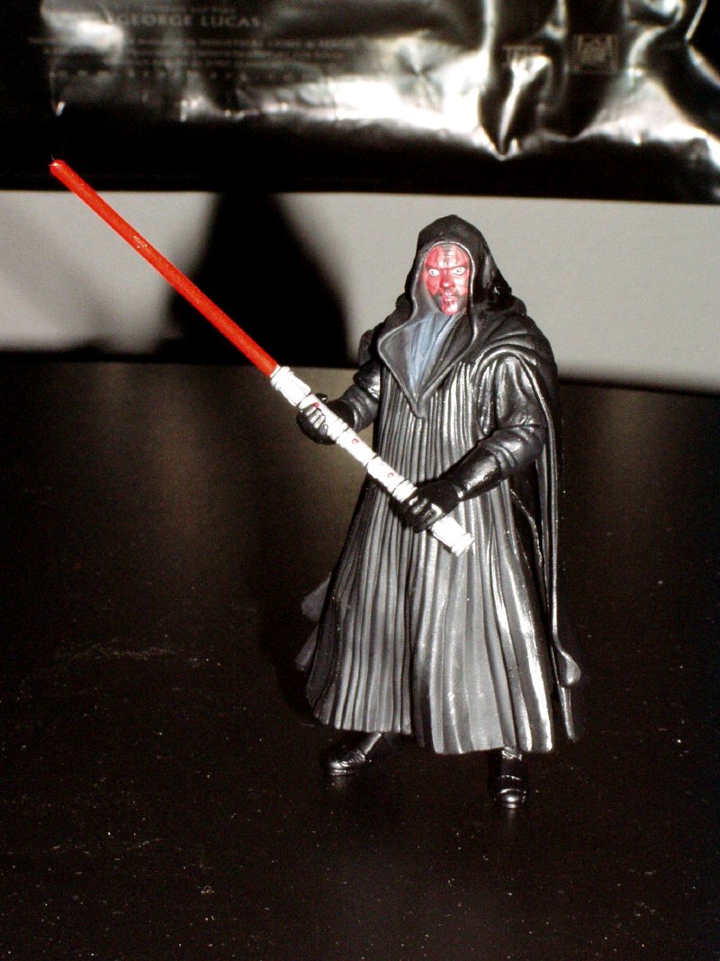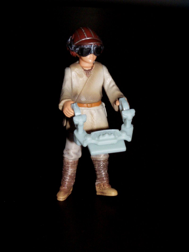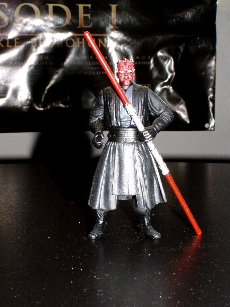 | Ankin Skywalker im Pilotendress auf Naboo, zu dieser Figur gehört noch ein Sprachchip, den man mit einem speziellen Gerät abspielen kann. zusätzlich gibt es noch den passenden Naboofighter. | Darth Maul mit dem "Doppelklingen" Laserschwert, mit dem er später Qui-Gon Jinn tötet. zu dieser Figur gehört ebenfalls ein Sprachchip. | |||